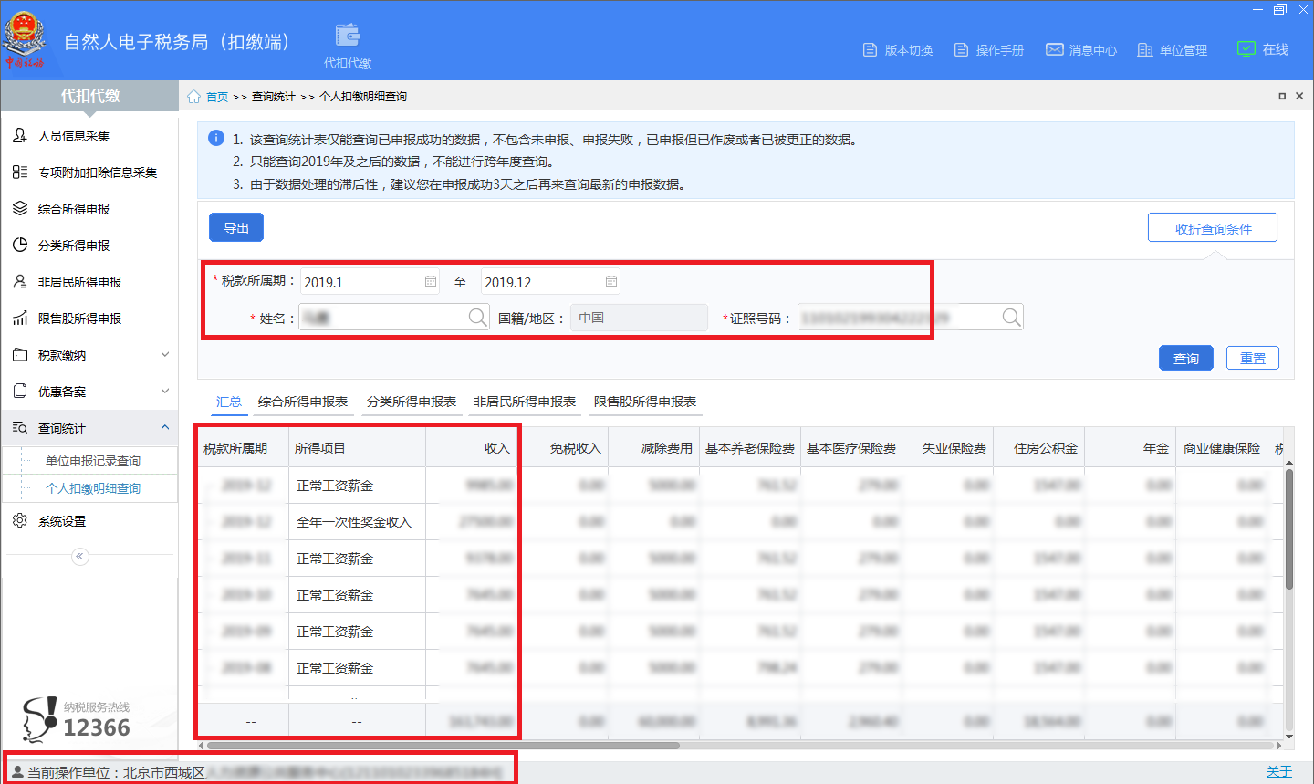 (2)2019年后报税截屏。单位登录“自然人税收管理系统”,在代扣代缴项目栏的查询统计功能中点击个人扣缴明细查询(样例参见附件4 ,须包含样例图示红框内容)”